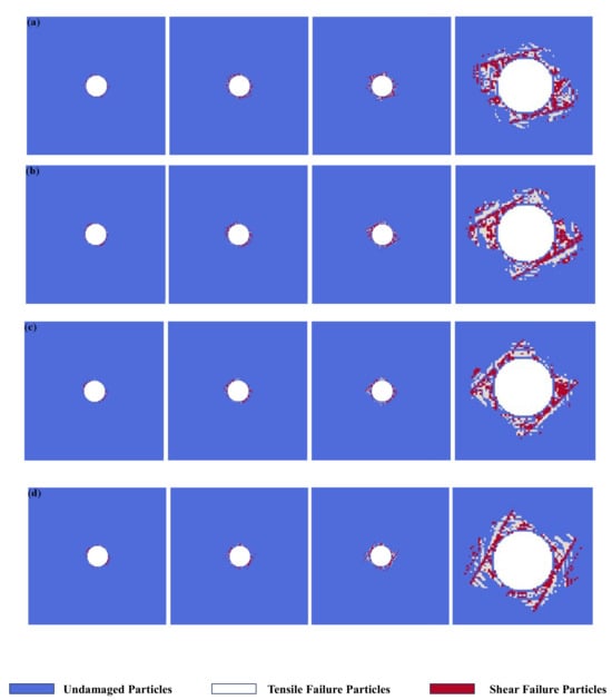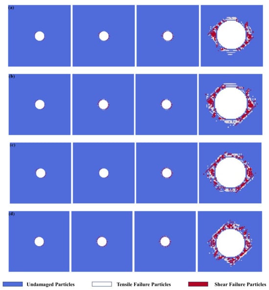 Figure 7 presents the numerical simulation results of the excavation damage process of bedding tunnels under different stress ratios. As can be seen from the figure, the evolution modes of tunnel excavation damage under different stress ratios are relatively similar. First, damage is generated around the tunnel. Then, the damage continuously evolves. Finally, a damage zone surrounding the tunnel is formed on the inner side of the two joints tangent to the tunnel, leading to the failure of the model. However, the final tunnel excavation damage ranges are different under various stress ratios. With the increase in stress ratio, the concentrated area of excavation damage gradually shifts from the three o′clock and nine o′clock directions around the tunnel to being concentrated around the tunnel. The damage degree also shows a gradually increasing rule with the increase in stress ratio.