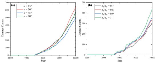 Figure 8 presents the variation laws of damage count under different calculation schemes. As can be seen from the figure, before 7000 calculation steps, there is no crack propagation. At the 7000th calculation step, the tunnel is excavated and the stress in the tunnel is released. Damage begins to occur at step 7500. After tunnel excavation, the damage increases sharply with the calculation steps, indicating that the destruction after tunnel excavation is relatively rapid. For different joint dip angles, the damage degree is the largest when α = 30° and the smallest when α = 45°. For different stress ratios, with the increase in stress ratio, the excavation damage degree of the tunnel gradually increases.