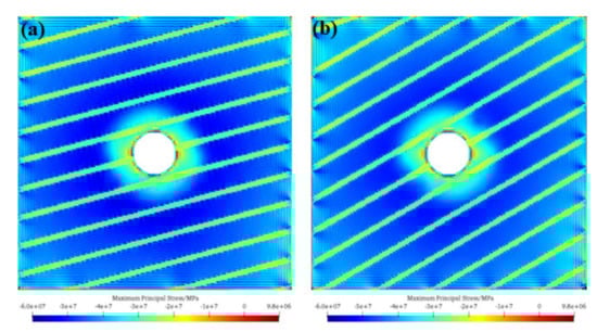 Figure 9 presents the maximum principal stress nephogram after tunnel excavation under different bedding dip angles. As can be seen from the figure, after tunnel excavation, stress is released. The compressive stress around the tunnel is significantly less than that inside the surrounding rock. At the same time, a small range of relatively high tensile stress concentration is generated around the tunnel, which is also the reason for the excavation damage around the tunnel. For α = 15° and α = 30°, the stress release range around the tunnel is large, so the final tunnel excavation damage degree is also large. For α = 45° and α = 60°, at the joint passing through the center of the tunnel, there is an obvious shrinking trend in the stress release range, indicating that the stress release degree is small at this time. Therefore, the damage degree of these two cases is slightly less than that of α = 15° and α = 30°.