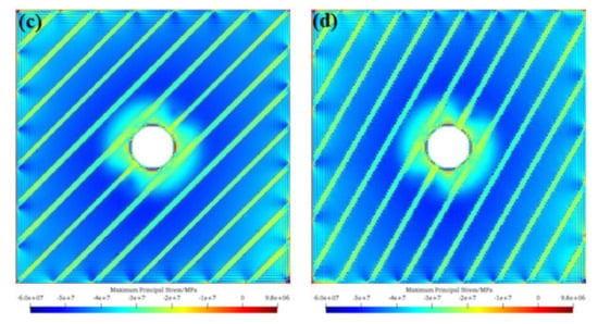 Maximum principal stress nephogram after tunnel excavation under different bedding dip angles. (a) α = 15°; (b) α = 30°; (c) α = 45°; (d) α = 60°.