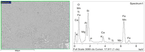 An electron microscopy analysis of the samples was conducted using a JEOL JSM-7001F scanning electron microscope with an OXFORD X-Max 80 energy-dispersive detector for elemental composition determination. The morphology and average chemical composition, determined after melting and quenching of the ore to homogenize the composition, are shown in Figure 1 and Table 2.