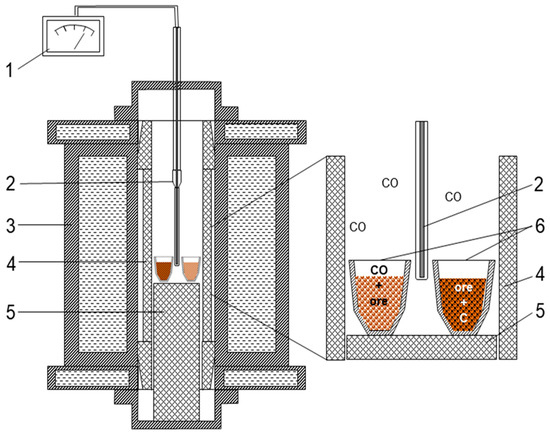 Reactor setup diagram: 1—multimeter; 2—hydrogen supply line; 3—corundum spheres for uniform gas distribution; 4—oolitic ore briquettes; 5—thermocouple; 6—exhaust gas line.