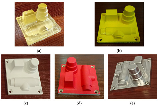 View of the evaluated samples: (a) PJM, (b) FDM, (c) SLS, (d) wood, (e) aluminum.