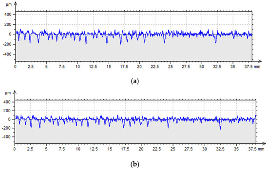 Example of surface profile: (a) before the forming process, (b) after the forming process (x axis—measurement length, y axis—irregularities height).