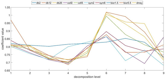 Statistical assessment of the values obtained, including evaluation of the profiles, was carried out based on the p-value parameter, which was calculated using one-way ANOVA. The calculations were performed in MATLAB R2021a (MathWorks, Natick, MA, USA). It is accepted that a critical value sufficient for determining similarity is p > 0.05. Calculations were implemented for each level of decomposition and mother wavelet. Shapiro–Wilk tests were used to test for the normal distributions of residuals.
