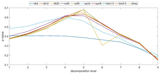 p-value as a function of mother wavelet and decomposition level, root mean square height parameter—PJM technology.