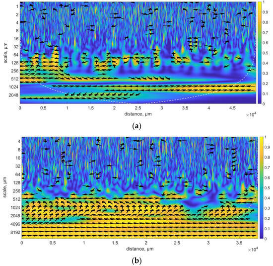 Analyzing the presented results, one can conclude that there are certain bands for which a high value of the wavelet coherent power spectrum was recorded. The values of the coefficient depicted in the above Figure 6a were determined for a sample made at a 0° building angle and a layer thickness of 0.254 mm, while in Figure 6b, the results are shown for a sample made at a 90° angle and a layer thickness of 0.016 mm. Analyzing the overall results for individual technologies and printing directions, analogous dependencies were noted. For scales presenting high-frequency information, individual coefficient values were defined in a way that did not allow for the identification of trends, patterns, or the discovery of functional relationships connecting technological process parameters and the distribution of surface irregularities. Local similarities were noted for individual samples, suggesting that the forming process significantly influenced changes in the distribution of surface irregularities. The noted similarities were concentrated in the range of larger scales, of the order of at least twice the thickness of the layer being built, depending on the technology. From this perspective, it is significant that even for surfaces made at a 0° angle, the correlation coefficient values mainly focused around the 0.512 mm scale, which was also identical for samples made at a 90° angle. Nevertheless, for samples made at a 0° angle, there were also similarities noted for a smaller scale value, but not along the entire length of the profiles. Analyzing the arrows depicted in the diagram, it can be concluded that for Figure 6a and the band corresponding to the scale of 0.512 mm, most of the arrows are oriented eastwards, which indicates the same phase relationship throughout the entire period for both profiles, with significant coherence and without any obvious dominant dependence. However, for larger scales, the tendency is the opposite, and the arrows are directed westward, which indicates a phase opposition. For the coefficients presented in Figure 6b, it was noted that the arrows are primarily oriented in the northern direction, suggesting that both profiles on a given scale are similar. However, the irregularities are shifted by one-quarter of the cycle and scale size.