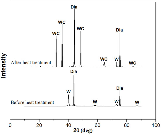Diamond has a strong inertness and is difficult for it to achieve good interfacial bonding with metals under general conditions. Introducing a carbide layer between the diamond and metal can improve the wetting and bonding of the metal to the diamond, thereby achieving the goal of enhancing the overall performance of the composite material. Carbides formed by elements such as boron, titanium, chromium, zirconium, and tungsten have been reported to improve the interface between the diamond and metal [31,32]. The carbides formed using W include W2C and WC, which have significantly different thermal conductivities. The thermal conductivity of W2C is only 36 W/mK, while the thermal conductivity of WC reaches 120 W/mK.