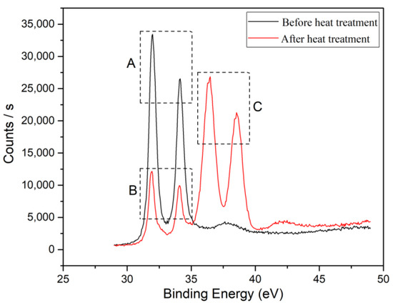 To confirm the formation of tungsten carbide on the surface of the diamond after heat treatment, XRD and XPS were used to detect the diamond powder before and after heat treatment, as shown in Figure 4 and Figure 5. From the XRD pattern in Figure 4, it can be seen that elemental tungsten undergoes a chemical reaction with diamond at a high temperature, forming tungsten carbide. Figure 5 shows the analysis results of the XPS. Ion etching was used to remove the 5~10 nm surface layer before the characterization of the sample. The pair of spectral peaks in box A represents the elemental tungsten before the heat treatment. The pair of spectral peaks in box B represents the residual elemental tungsten after the heat treatment. The pair of spectral peaks in the C box represents tungsten in the +4 valence state. The relative height of the spectral peak represents the content of tungsten in the corresponding valence state, indicating that most of the elemental tungsten in the coating has reacted with diamond to form tungsten carbide. Tungsten carbide will act as a glue between the diamond and aluminum alloy, enhancing the bonding strength at the interface and improving the overall thermal performance of the composite material.
