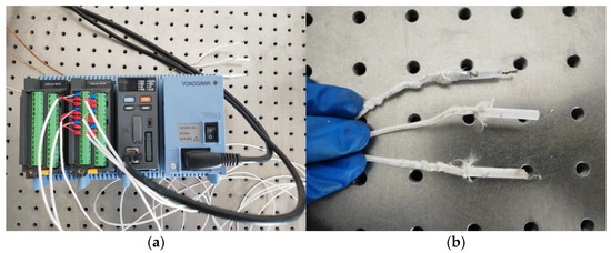 Testing experiment on the relationship between laser power and spot temperature: (a) thermometer; (b) thermocouple.