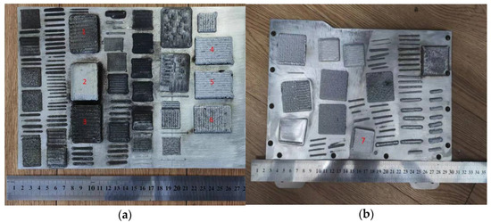 Samples prepared by laser cladding: (a) 1#~6# aluminum alloy/diamond composite materials; (b) 7# aluminum alloy.