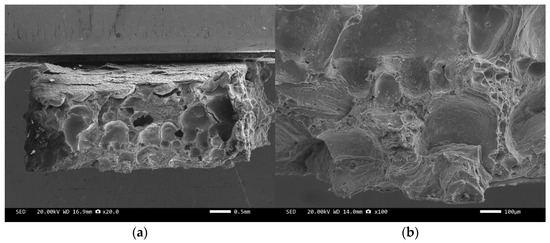 SEM image of sample 4#: (a) ×50, (b) ×100.