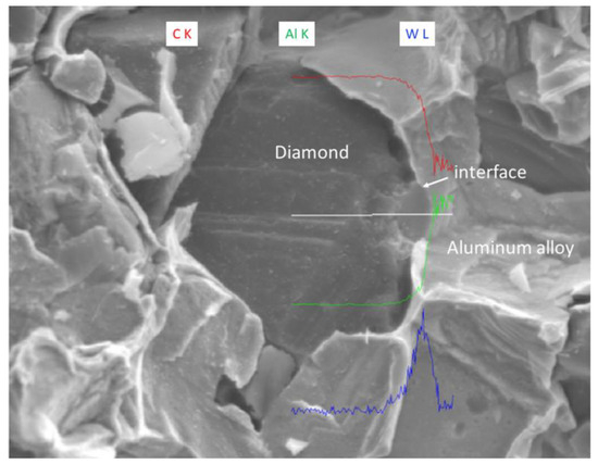 The EDS (Energy Dispersive Spectroscopy) analysis results of sample 6# are shown in Figure 15, indicating that tungsten element did not migrate at the interface between the diamond and aluminum alloy. The EPMA (Electron Probe X-ray Microanalysis) results for sample #6 are shown in Figure 16, where tungsten element is uniformly distributed on the surface of the diamond. From the above experimental results, it can be seen that there is no interdiffusion of elements between the tungsten-plated diamond and aluminum alloy substrate during the laser cladding process. Aluminum alloy melts under the action of laser and tungsten-coated diamond is wrapped in liquid metal and then cooled to form an aluminum alloy diamond composite material.