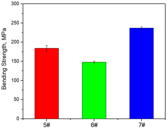 Figure 17, Figure 18 and Figure 19 show the specific heat curves, flexural strength bar charts, and linear thermal expansion curves of three materials. The room temperature specific heats (c) of materials 5#, 6#, and 7# are 0.780 J/gk, 0.744 J/gk, and 0.886 J/gk, respectively, and the thermal diffusion coefficients (α) are 93.90 mm2/s, 83.73 mm2/s, and 57.60 mm2/s, respectively. The mathematical relationship between the thermal conductivity (λ) and thermal diffusivity (α) is λ = αρc, where ρ is the density and c is the specific heat. The room temperature thermal conductivities of materials 5#, 6#, and 7# were calculated to be 200.68 W/mK, 161.34 W/mK, and 135.75 W/mK, respectively, and the bending strengths are 184 MPa, 148 MPa, and 237 MPa, respectively. The average linear thermal expansion coefficients of materials 5#, 6#, and 7# within the temperature range of 20~120 °C (the operating temperature range of electronic devices) are 1.904 × 10−5/K, 1.575 × 10−5/K, and 2.140 × 10−5/K, respectively. The mechanical and thermal performance data of the three materials are shown in Table 4.