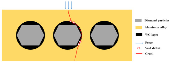 The mechanical properties of the material exhibit a significant “cask effect”, where the internal pore defects and micro interfaces of the composite material are the “short boards of the bucket”. And pore defects often appear at the micro interface, so the mechanical properties of the composite materials significantly decrease with the increase in the diamond content. The schematic diagram of the bending fracture of the composite materials is shown in Figure 20. Cracks often initiate at the defect of the interface and propagate along the interface, leading to material fracture, which greatly weakens the bending strength of the material.