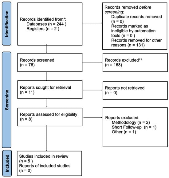 The electronic search rendered 244 titles in total (Figure 1). One potentially eligible article was identified on the basis of a manual search. The gray literature did not result in any additional articles. Eleven articles of the remaining 76 were excluded after full-text analysis. The remaining eight articles were assessed for eligibility. Ultimately, five articles fully met the selection criteria for a qualitative analysis [25,26,27,28,29], as described in Table 1.