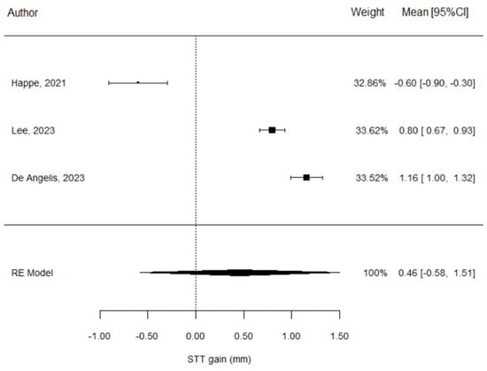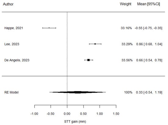 The main outcomes of the studies were the variations in the STT and KTW in both groups, with follow-up periods of a minimum of 6 months. Only some studies reported the mean variation with the SD, which was included in the meta-analysis [25,27,29]. For the meta-analysis, only three had 12-month information for the STT [25,27,29] and only one for the KTW [27]. Therefore, the statistical analysis was restricted to the variation in the STT at a follow-up period of 12 months, between the ADM group and the aCTG control group.