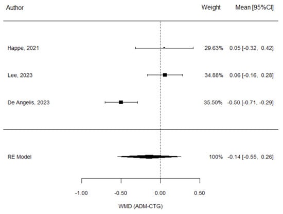 The meta-analysis yielded a weighted mean difference (WMD) of −0.14 mm, favoring the control aCTG group, but with no significant statistical difference between the two groups (p = 0.490) (Table 6).