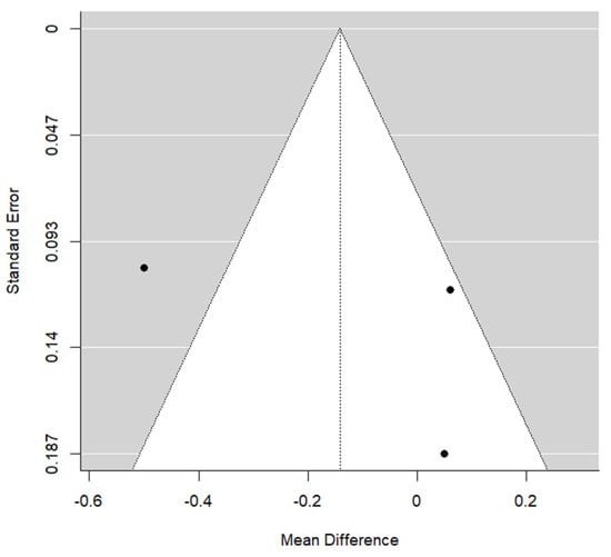 There was a high level of heterogeneity among the values (I2 = 98.7%). Following the trend in the other analysis, there was no correlation regarding the results between Happe et al. [26] and the other studies. In this part of the analysis, publication bias could not be detected. This was due to the three studies having a similar level of precision in regard to their analyses (Figure 5).