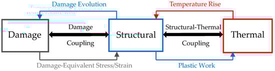 In the current work, a doubly coupled FE analysis was carried out by implementing a structural-thermal-damage coupling during modeling development. In more detail, the two couplings took place between structural-thermal and structural-damage fields, allowing for simulation of the effect of thermal and damage softening mechanisms, respectively.