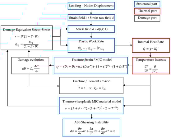 In addition, the coupling between the structural-damage fields allows for the assessment of the influence of the damage softening magnitude on ASB evolution and its transition to fracture. In fact, the double coupled analysis allows to investigate the influence of thermal and damage softening mechanisms on ASB initiation and evolution, attributing them distinct roles. Figure 2 shows that the structural solver calculates the damage evolution by assessing the damage magnitude and the plastic strain failure, while the damage part feeds back the structural solver with the damage-equivalent stress, strain and strain rate. The interaction between the two parts is feasible due to the implementation of a damage criterion and the introduction of the β-parameter, which is set equal to 1 for full coupling. The damage softening is predicted due to the fact that the damage-equivalent strain is lower than the original one for a certain damage extent, resulting in lower plastic flow stress, which increases stress triaxiality. Therefore, plastic strain failure decreases due to the negative D3 damage parameter, revealing fractures earlier and facilitating damage propagation.