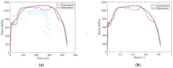 The developed FE modeling approach was validated against experimental data provided from a high strain rate compression test of the AISI 4340 stainless steel cylindrical specimen. Specifically, the experiment which utilized during the validating procedure was conducted by Odeshi et al. [15], studying a 4340 steel sample of 9.55 mm in diameter and 10.55 mm in height. The dynamic compression test was carried out in an SHPB system under 1900 s−1 strain rate, while the stress–time and stress–strain curves were produced. In addition, the ASB formation was observed through optical micrographs along the longitudinal section of the impacted sample.