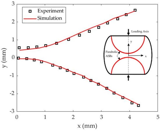 Therefore, the comparison between the model and the experiment is focused on the stress–time and stress–strain curves which reveal the timing tcr and the critical strain εcr for ASB initiation which coincides with the instability point of peak stress, while the accuracy in predicting the ASB trajectory is also evaluated. In particular, Figure 4 depicts the stress fluctuation with time and strain, showing that the prediction of flow stress by the simulation comes in sufficient agreement with the experimental one. Specifically, the simulation predicted a peak stress of 1123 MPa, revealing a relative error of about 2%, while the instability point was predicted to exhibit a critical strain of 0.486 at 297 μs providing deviation against the experiment below 7%, as Table 3 describes. Finally, both simulation and experiment revealed two conical-shaped and parabolic ASBs which formed along the maximum shear direction and met at the sample center, while Figure 5 illustrates the ASB trajectories in the half-axisymmetric domain of the longitudinal section, indicating that the trace of upper and lower parabolic ASBs was captured accurately by the FE simulation.