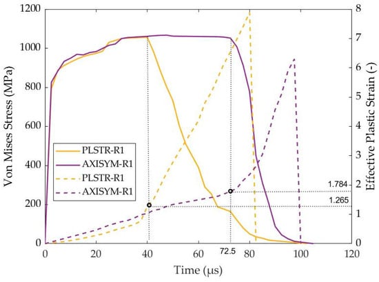 Flow stress (solid lines) and effective plastic strain (dashed lines) with time for PLSTR-R1 and AXISYM-R1 simulations.