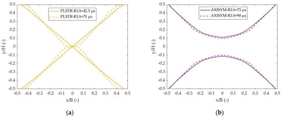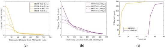 Further, Figure 8a,b depict the distribution of effective plastic strain transversely to ASB direction for plane strain and axisymmetric compression, respectively, allowing for the detection of ASB width as the extent of the area with higher strain than the critical value. Thus, the zone of strain higher than 1.265 and the one with strain higher than 1.784 predicted the semi-width of the ASBs at various times in the case of the plane strain and axisymmetric compressions, respectively, while Figure 8c shows the ASB width evolution with time. The earlier ASB initiation in the case of the PLSTR-R1 simulation revealed greater strain magnitude inside the ASB core, while in both cases the ASBs widened rapidly at first and then they seemed to reduce their widening rate as their transition to fracture began. Figure 8c shows that ASB width in plane strain compression was marginally greater, reaching about 140 μm in contrast to the axisymmetric case where ASB widened until it reached 134 μm.