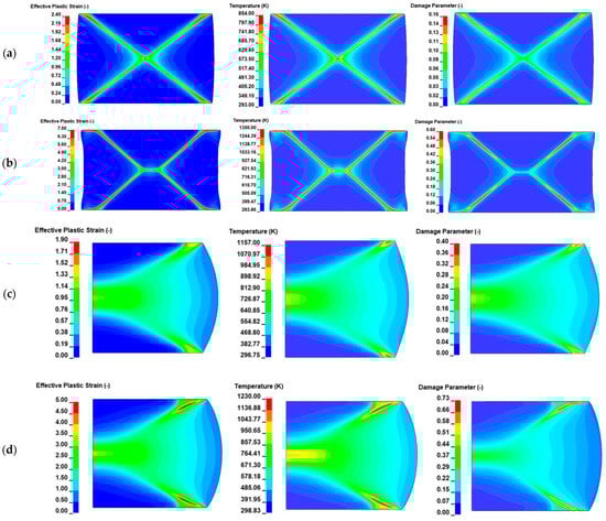 Figure 9 visualizes the strain, temperature and damage fields at different times for both examined cases. Specifically, Figure 9a depicts that X-shaped ASBs were initially formed at plane strain compression with higher intensity around the sample corners and propagated along the maximum shear direction until the central kink. In fact, the temperature rise seemed significant at the sample corners, triggering ASB generation there, while damage magnitude seemed more intense moving slightly sideways, driving the ASB evolution until it reached the center. At a higher compressive strain, S-shaped ASBs seemed to form by horizontally elongating the central meeting point, which attributed to the ASB’s trajectory in an S-like trace, as depicted in Figure 9b. On the contrary, the respective fields seemed more diffused in the case of axisymmetric compression as shown in Figure 9c,d, where the distinct detection of the ASB trace seemed more challenging. In fact, strain and damage tended to be more localized as deformation increased in contrast to temperature field, which seemed more diffused, providing a wider heat-affected zone.