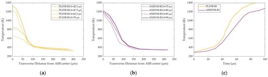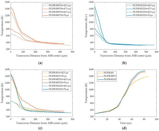 Figure 15a,b illustrate the temperature distribution transversely to the ASB direction, showing that the heat-affected zone was wider than the actual ASB width due to the more diffused temperature field. Both PLSTR-R075 and PLSTR-R125 simulations reached a greater maximum temperature compared with PLSTR-R1, as confirmed in Figure 15c, due to their earlier ASB initiation, which allowed more time for ASB development during which the increased localized shear strain led to greater plastic work and internal heat, causing higher temperature rise. Also, Figure 15a,b demonstrate that the temperature field within ASB not only increased but also widened with time, showing a wider temperature localization in the ASB region compared with the strain localization, which was found to be narrower. Last but not least, Figure 15d reveals that the magnitude of temperature rise in each case of HBR value was almost the same until 55 μs, showing that the different geometries behaved similarly between each other during the stable plastic deformation and the early ASB stages. In fact, the early ASB stages around 40 μs revealed the greater temperature increase rate, as shown in Figure 15d, by the slope of the curves, while the final evolution stages of ASB seemed to reduce the temperature increase rate as their transition to fracture was dominated by the stronger damage softening mechanism.