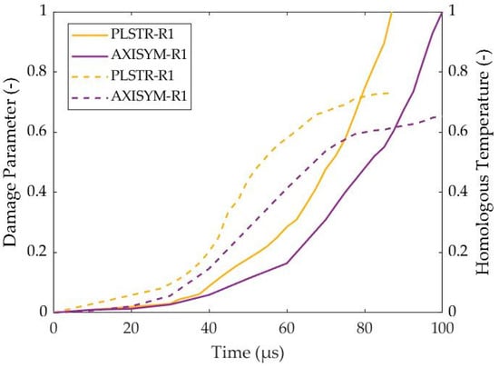 In this work, the damage parameter reflected proportionally the magnitude of damage softening during the fully coupled structural-damage analysis under a β-parameter equal to 1, and the homologous temperature also reflected proportionally the magnitude of thermal softening due to the m-parameter, which is equal to 1 in the MJC constitutive relation. In that way, Figure 11 reveals that thermal softening mechanism is responsible for ASB genesis and its initial evolution due to its stronger magnitude at earlier stages around 40 μs and 72.5 μs for plane strain and axisymmetric compressions, respectively. On the other hand, damage softening seems to drive the later ASB evolution stages and its transition to fracture when the damage parameter overcomes the magnitude of homologous temperature.