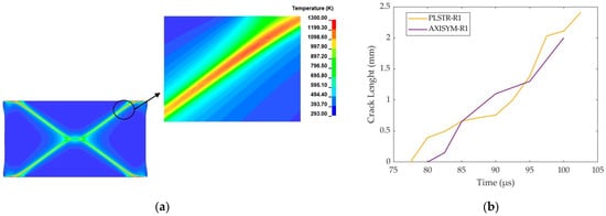 Specifically, the transition from ASB to fracture was enhanced by the increased damage extent and dispersed hot spots which acted like fracture triggers. In fact, the hot spots shown in Figure 12a, together with damage increment, generate micro-voiding, which was elongated along the ASB direction, creating micro-cracks whose coalescence resulted in cracking failure via mode-II cracking propagating. Figure 12b depicts the evolution of cracking length with time, showing that the mean propagation velocity of cracks was similar in both plane strain and axisymmetric compression cases. Finally, Figure 12c,d demonstrate that both rectangular and cylindrical samples fail under four developing cracks, which started from the corners and propagated along the softened ASB structure until the center of the sample and alongside the trace of the localized damage increment.