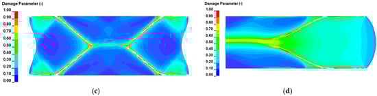 In addition, Equation (10) describes the damage-equivalent Von Mises stress relatively to the stress field and the damage extent. In that way, the structural-damage coupling conjugates the mechanical stress state with the damage evolution, simulating the damage-softening effect. In particular, with the increase in damage evolution, the greater D-parameter results in higher damage-equivalent stress together with lower damage-equivalent strain. In fact, the last one decreases the stress magnitude from Equation (1), reacting to increased stress triaxiality and, in consequence, a decrease in plastic strain failure due to the negative value of D3 damage parameter. Therefore, the influence of damage coupling on fracture initiation remains crucial as it reveals the effect of the damage softening mechanism.