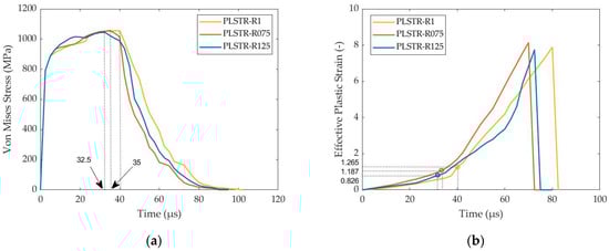 This case study investigates the influence of height-to-base ratio (HBR) on ASB formation during plane strain compression of orthogonal 1045 steel samples. The examined cases consist of 0.75–1–1.25 HBR values with the models named PLSTR-R075, PLSTR-R1 and PLSTR-R125, respectively. Figure 13a depicts the time fluctuation of flow stress, showing that ASB genesis appears at 35–40–32.5 μs and, in consequence, at compressive true strains of 15–17.4–14% for HBRs of 0.75–1–1.25, respectively. Looking at the time fluctuation of effective plastic strain in Figure 13b, the critical strain value to detect the ASB genesis lies at 1.187–1.265–0.826 for HBRs of 0.75–1–1.25, respectively. Therefore, the steel sample of HBR equal to 1.25 manifested earlier at the ASB onset, revealing the lowest critical strain, in contrast to the sample of HBR equal to 1, which delayed the ASB initiation more. In that way, rectangular geometries seem to increase ASB susceptibility compared with square samples, reacting to earlier ASB appearance. However, the ASB intensity seems almost equal for all models, reaching a peak effective plastic strain of about 8 inside its core.