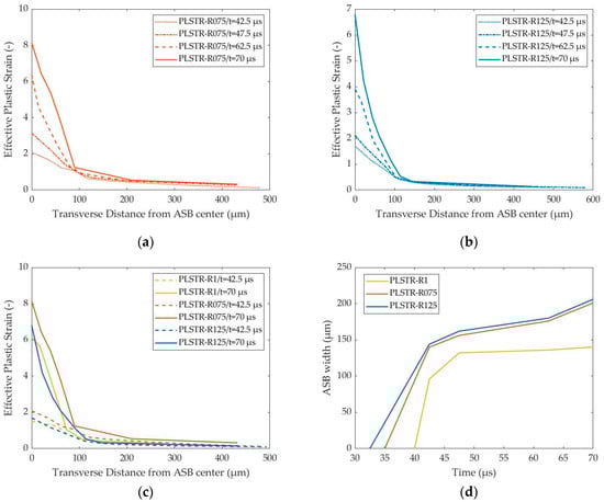 Transverse distribution of effective plastic strain and ASB width evolution with time for the plane strain models of different HBRs: (a) strain transverse distribution with time for PLSTR-R075 model; (b) strain transverse distribution with time for PLSTR-R125 model; (c) comparative strain transverse distributions at 42.5 and 70 μs; (d) ASB width evolution with time.