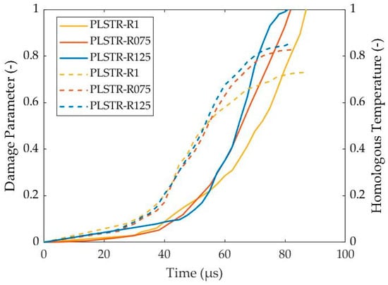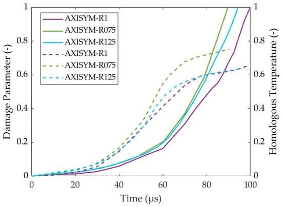 Evolution of damage (solid lines) and homologous temperature (dashed lines) with time.