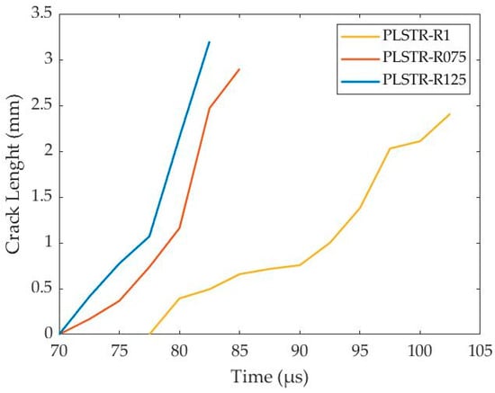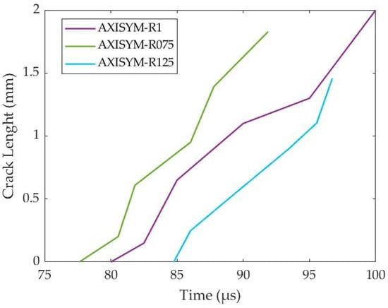 Cracking length with time for the axisymmetric compression models with different HBR values.