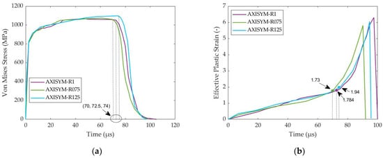 In this part, a similar parametric analysis of HBR was conducted regarding the axisymmetric compression of cylindrical 1045 steel samples. The examined values of HBR were 0.75–1–1.25 again, with the simulated models being AXISYM-R075, AXISYM-R1 and AXISYM-R125, respectively. As Figure 18a demonstrates, the AXISYM-R075 revealed the earliest instability point and, in consequence, the earliest ASB genesis at 70 μs and 32.9% compressive true strain considering the loading velocity of 20 m/s and the initial height of 5 mm, while AXISYM-R1 revealed the next ASB onset at 72.5 μs and 34% compressive true strain. On the other hand, AXISYM-R125 showed the greatest delay on ASB appearance, which took place at 74 μs and 35% true strain, concluding that lower the HBR was, the sooner the ASB was exhibited. Therefore, reduced HBR seems to promote ASB formation in cylindrical axisymmetric compression. With respect to the timing of ASB onset, the critical effective plastic strain values were detected for each case from Figure 18b, revealing the critical strains of 1.73–1.784–1.94 for the HBRs of 0.75–1–1.25, respectively. Also, the strain localization magnitude seemed to clearly increase with higher rate after ASB initiation, as obtained from the slopes of the curves in Figure 18b, while the earlier ASB initiation in the case of the AXISYM-R075 model led to sooner fracture.