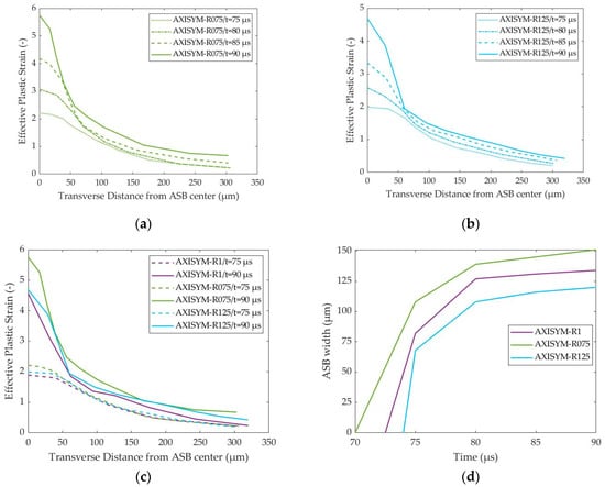 Figure 19a,b show that the localized strain field inside ASB increased its magnitude and widened as deformation progressed for both HBRs of 0.75 and 1.25, as well as for the HBR of 1, as Figure 8b depicts. More specifically, the strain field within ASB reached higher peak strain with time increment and greater ASB width, which was determined as the zone extent characterized by effective plastic strain, which was higher than the critical strain. Figure 19c demonstrates that AXISYM-R075 revealed more intense strain localization with greater peak strain for the same time, which was attributed to the earlier ASB appearance which allowed more time for ASB to develop and grow. However, Figure 18b illustrates that the AXISYM-R1 and AXISYM-R125 models reveal higher final effective plastic strain inside the ASB core due to delayed fracture compared with AXISYM-R075. Finally, Figure 19d reveals that earlier ASB onset results in greater ASB width with AXISYM-R075 reaching a maximum width of 150 μm, which remained lower than the one in the case of plane strain compression, which lied about 205 μm. The above comes in agreement with the conclusion that plane strain compression promotes ASB formation more, leading to earlier initiation and greater width. Finally, all simulations showed a higher widening rate at the early stages of ASB evolution after its genesis, while the ASB width was almost stabilized at the final stages of ASB evolution before fracture.
