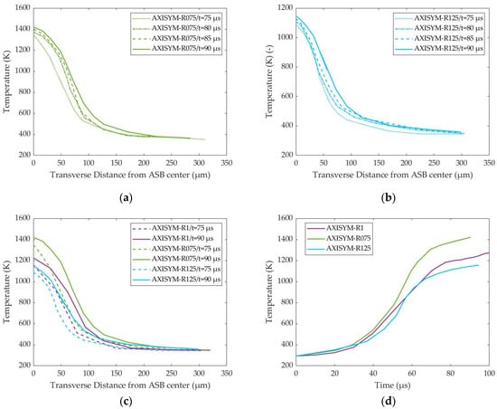 Transverse distribution of temperature with time and temperature–time fluctuation within ASB for the axisymmetric models of different HBR: (a) temperature transverse distribution with time for AXISYM-R075 model; (b) temperature transverse distribution with time for AXISYM-R125 model; (c) comparative temperature transverse distributions at 75 and 90 μs; (d) temperature–time curves inside ASB core.