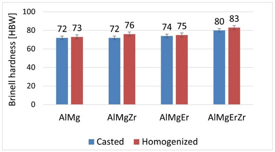 - Micro-alloying elements resulted in a reduction in the average grain size in the ingots by almost four times. The alloys with micro-additions were characterized by a homogeneous structure comprising equiaxed grains. The grain refinement was caused by the presence of small precipitates of primary phases containing Er and Zr, which crystallize first in the liquid melt and constitute crystallization nuclei for the solid aluminum solution.