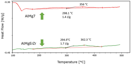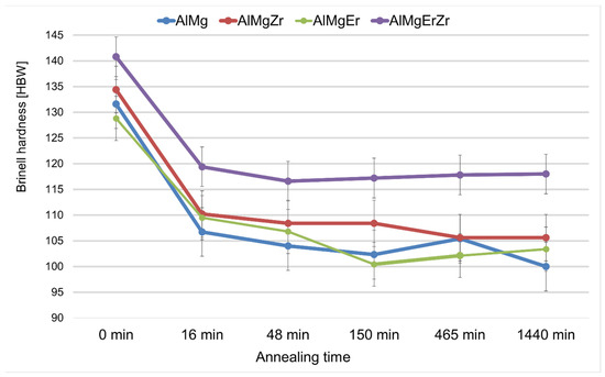 - The simultaneous addition of Er and Zr to AlMg7 significantly improved the durability of the mechanical properties after annealing. It was caused by forming spherical Al3(Er, Zr) dispersoids with a diameter of about 20 nm, which inhibited the movement of dislocations during annealing. The pinning effect of Al3(Er, Zr) dispersoids supported sub-structure strengthening at an elevated temperature, resulting in the formation of an alloy characterized by stable mechanical properties. The fractions of recrystallized grains based on the GAM ≤ 0.5° parameter were about 5%. The Er and Zr single additives of AlMg7 slightly restrained the decrease in the Brinell hardness after annealing but did not inhibit the processes of its decrease after annealing. The fractions of recrystallized grains based on the GAM ≤ 0.5° parameter were about 20%. The highest decrease in Brinell hardness revealed the alloy without micro-alloying elements. This was caused by the microstructure reconstruction during annealing, which resulted in the dislocation annihilation. The fraction of recrystallized grains based on the GAM ≤ 0.5° parameter was about 35% for the AlMg7 alloy. These results correlated with a strengthening analysis based on the Brinell hardness measurement, as the highest decrease in hardness was demonstrated in AlMg7, AlMg7Zr, and AlMg7Er alloys. The share of the fraction after recovery and recrystallization based on the GAM parameter in the alloys was over three times higher than in the AlMgErZr alloy.