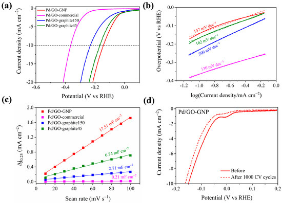 The HER performances of Pd/GO catalysts were evaluated using the LSV technique with a 1600 rpm rotation speed. The catalytic current at 10 mA cm−2 was fixed as the benchmark for comparing the performance of different catalysts. Among all the catalysts, Pd/GO-GNP showed the best catalytic performance for HER with a lower overpotential (143 mV@10mA cm−2) than the others, Figure 2a. The activity trend followed in the order of Pd/GO-GNP > Pd/GO-graphite45 > Pd/GO-graphite150 > Pd/GO-commercial. Control experiments were performed using GOs without the Pd loading under identical conditions (Figure S1). The resultant LSV curves confirmed that no significant activity was brought by GO alone, suggesting that GO itself is less conductive. The improved activity may arise from the combined benefits of Pd NPs and GO support. It can be anticipated that when supported on GO, Pd/GO catalysts exhibit enhanced catalytic performance because of better Pd dispersion and electronic interactions with GO and by offering high surface-to-volume ratios, with an increased number of catalytic sites available for reactions.