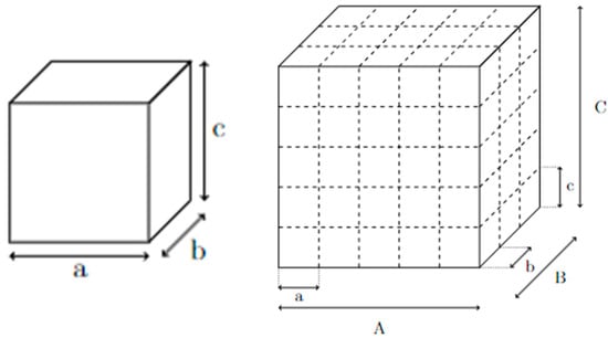 Lattice structures are generally the repetition of a unit cell (Figure 1). The unit cell is a basic building block of all structures made of lattice. Each unit cell can be described as a building block for the general structure [17]. Most of the time, it is represented by its length, width, height, and the thickness of the elements composing the unit cell [18]. In Figure 1, a, b, and c are the dimensions of the unit cell, and na = A/a is the number of unit cells in the length A. In the same way, nb and nc are, respectively, the number of unit cells in the B and C length [19,20]. Figure 1 shows an example of the decomposition of a bigger block (right-hand side of Figure 1) into a simple lattice cell (left-hand side of Figure 1).