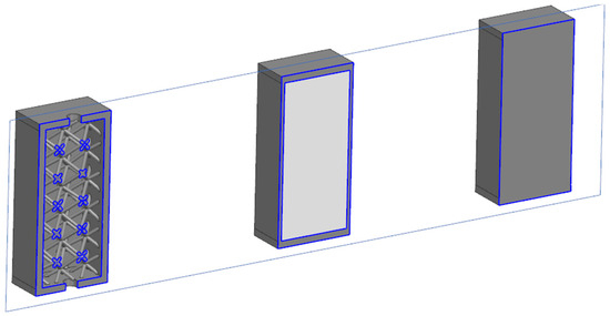 The testing was performed on 3D-printed specimens according the following description: The solid specimen (marked “S”, blue color in Figure 8) is a 30 mm PA12GB cube. All other geometries are derived from this solid. The lattice specimen (marked “L”, grey color in Figure 9) has 2 mm diameter struts, and the boxed lattice with powder (marked “BLP”, green color in Figure 8) is filled with PA12GB powder. For the compression tests, the geometries used for the experimentation and the simulations were simple bricks of PA12GB with a side length of 30 mm. The parameters during testing were a speed of 10 mm per minute, constant loading, and an ambient temperature in the testing room (22 °C). The hydromechanical testing machine was used for this test.