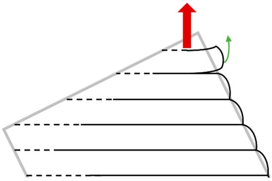 As explained above, the 3D-printing process inherently induces anisotropy in the specimen’s structure due to its layer-by-layer method of material deposition. These mechanical properties of the printed part can vary depending on the direction of the applied load relative to the orientation of the print layers. Typically, the strength and stiffness of the material are different in the layer deposition direction compared to the directions perpendicular to it, resulting in anisotropic behavior. This is mainly due to the noncontinuity in the perpendicular direction caused by the sticking in-between layers (Figure 6).