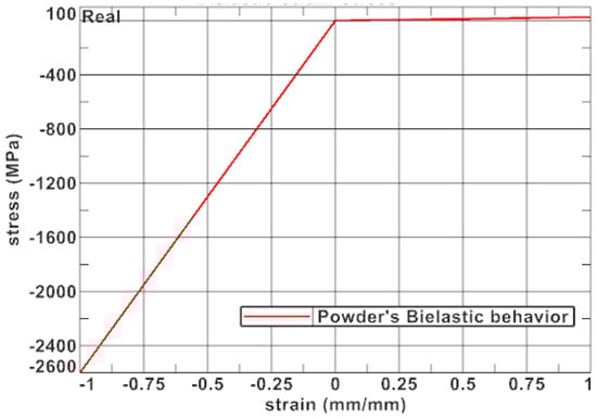 To achieve such characteristics, a good approach could be a bi-elastic material (Figure 8) with a bigger Young’s modulus in compression and a negligeable one in tension. This is a rough approach that does not represent the powder’s capacity to densify itself under compression but which is easy to be numerically modeled.