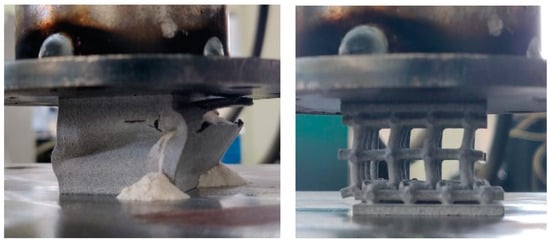 At the beginning of each force–displacement curve, a small, nonlinear portion is observed. This initial nonlinearity can be explained by the mechanical influence of gaps between the components of the press, which need to be taken up before the full load is applied to the specimen. Once these gaps are closed, the force is transmitted more directly to the specimen, resulting in a linear response that reflects the material’s elastic behavior. It should also be noted that the reaction force also takes into account the stiffness of the machine, which is not determined in this study. An example of the testing is shown in Figure 10. It is obvious that for the boxed lattice specimen with powder, the collapse of the side wall is the crucial point. After this point, the structure loses its stability, and the stiffness is reduced significantly. For the lattice structure without powder, the behavior of the collapsing is interesting. It is obvious that layers (oriented perpendicularly to the compression force) are collapsing gradually, one by one. Each collapse of an individual layer is connected with the individual peak of stiffness. From an operational point of view, the course of behavior until the collapse of the first layer is important.
