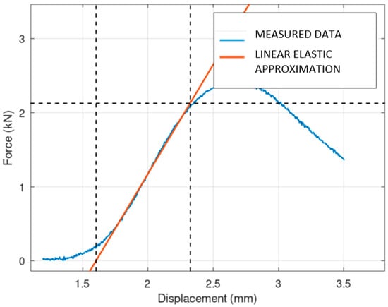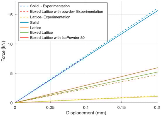 The results of mechanical compression testing for all types of specimens are shown in the following three figures (Figure 11, Figure 12 and Figure 13). The dependency between the applied force and displacement is shown. The testing results are in blue, and the linear elastic approximation of the results is shown in red. It is obvious that the solid specimen is able to survive the highest loading, and the lattice the lowest loading.